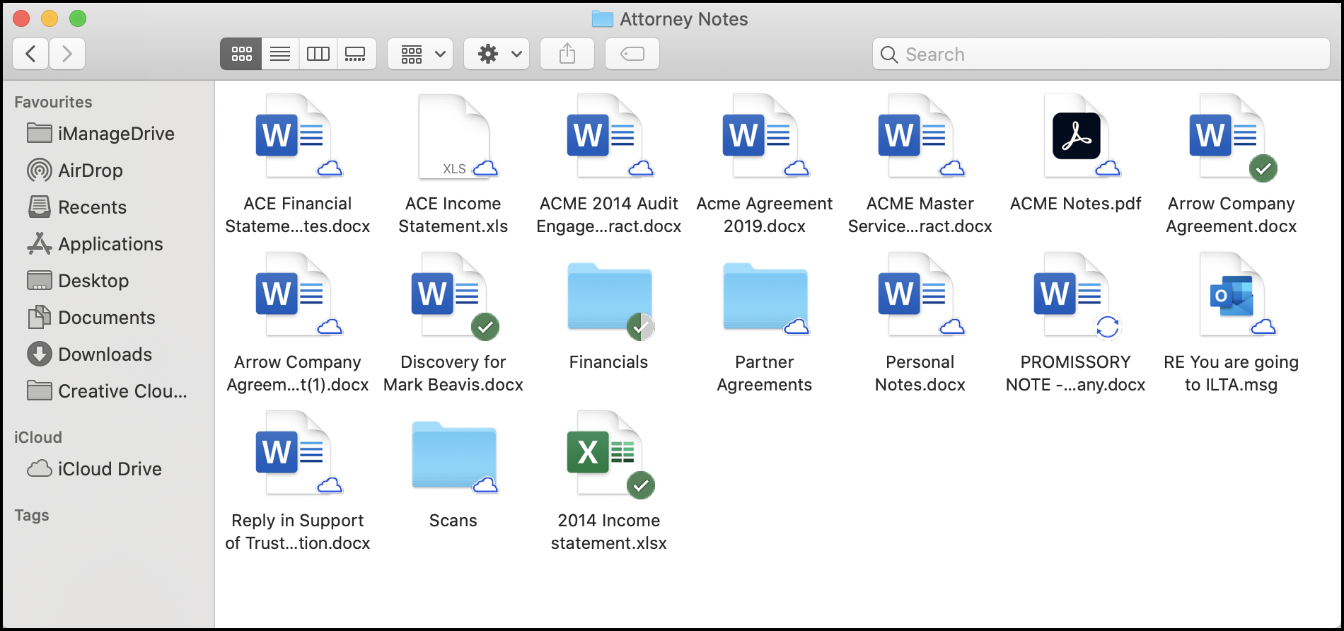 In der folgenden Abbildung werden Dateien mit dem Cloud-Symbol und dem grünen Häkchensymbol angezeigt. Die mit dem Cloud-Symbol markierten Dateien können in iManage Work aufgerufen werden, sind aber nur verfügbar, wenn Sie online sind. Die Dateien mit grünem Häkchensymbol wurden auf Ihr lokales Laufwerk heruntergeladen, so dass Sie auch offline mit ihnen arbeiten können.