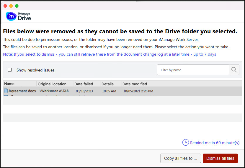 Wir haben das Dialogfenster Synchronisierungsprobleme anzeigen in iManage Drive for Mac 10.9.0 verbessert. Alle Elemente, bei denen ein Synchronisierungskonflikt erkannt wurde, sind im Dialogfenster nun vorab ausgewählt. Die verfügbaren Optionen zum Beheben der Synchronisierungsprobleme werde nun ebenfalls gut sichtbar am Fuß des Dialogfensters angezeigt.