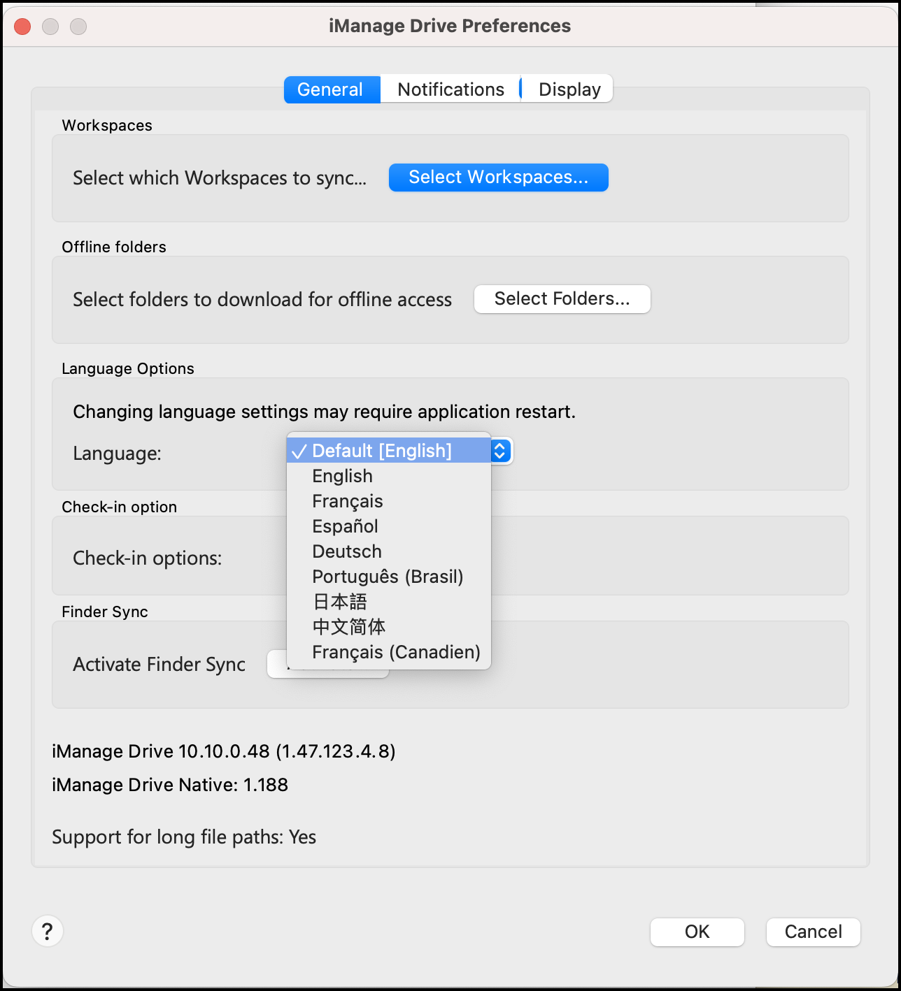 Sie können jetzt Kanadisches Französisch als Sprache für die iManage Drive-Benutzeroberfläche festlegen, indem Sie Kanadisches Französisch in der Dropdown-Liste Sprache auf der Registerkarte Präferenzen auswählen. Für weitere Informationen zum Ändern der Anwendungssprache lesen Sie bitte den Abschnitt Ändern der Anwendungssprache.