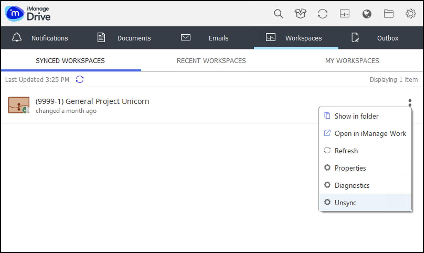 Darüber hinaus haben wir den Eintrag im Arbeitsbereich-Menü von Verknüpfung trennen auf Zu Entsynchronisieren geändert. Wenn Sie von nun an also Angelegenheiten von der iManage Drive-Konsole aus Synchronisierte Angelegenheiten, Meine Angelegenheiten oder Jüngste Angelegenheiten entsynchronisieren, müssen Sie, wie in der Abbildung unterhalb dargestellt, Entsynchronisieren anstatt Verknüpfung trennen auswählen. Die Suchfunktion ist in iManage Drive for Mac 10.9.0 oder einer späteren Version zu finden.