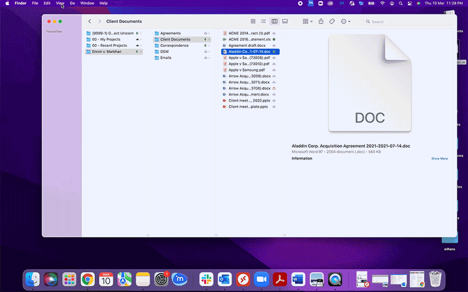 Sie können jetzt in Finder eine Vorschau von Dokumenten anzeigen lassen, indem Sie die Option Vorschau aktivieren. Um eine Vorschau der Dokumente anzeigen zu lassen, wählen Sie auf der Registerkarte Ansicht die Option als Spalten, klicken Sie mit der rechten Maustaste auf ein beliebiges Dokument in Ihrem iManage Drive-Verzeichnis und wählen Sie dann Vorschau aktivieren.