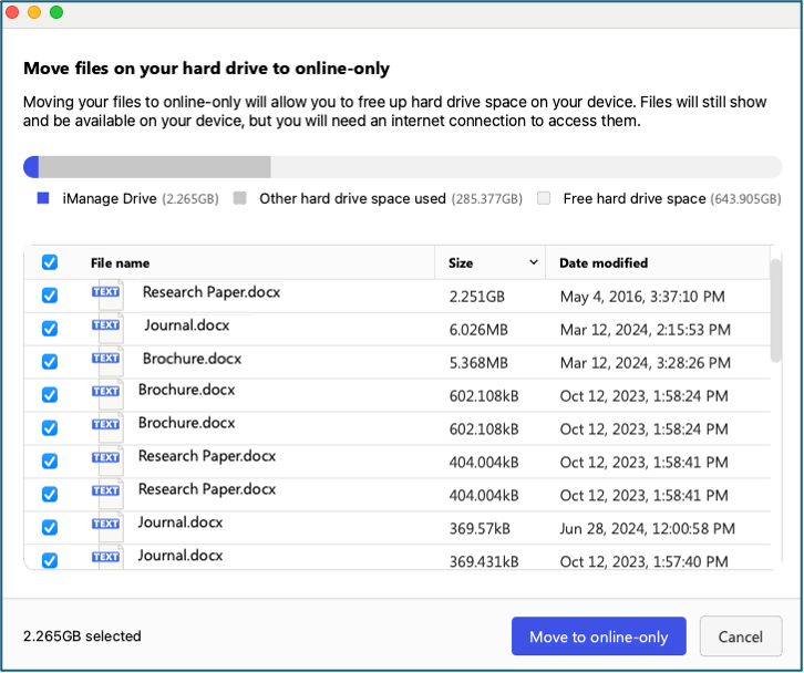 A new dialog Manage Disk Space is now available that can be used to free disk space in iManage Drive. This option is accessed by selecting and then selecting Manage Disk Space. The following dialog is displayed. You can select the file(s) by selecting the check boxes near the file name. Alternatively, you can also select the check box near File name to select all the files. The total size of the files selected is displayed in the lower left corner of the dialog. Selecting Move to online-only frees up the disk space used and the files can no longer be accessed when offline.