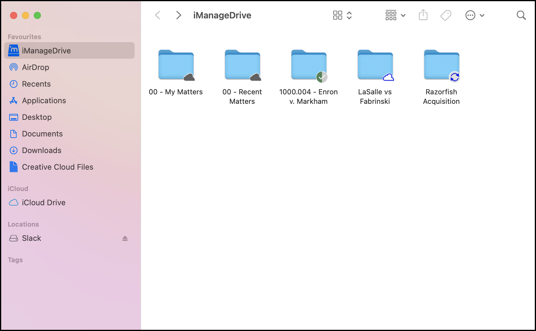 When syncing is complete, the workspace continues to appear in the My Matters or Recent Matters folder but the icon changes to indicating that the metadata is now synced to your mapped drive. Double-click the workspace to view the content in it, which also displays the icon. The workspace also appears in the root folder in your mapped drive.