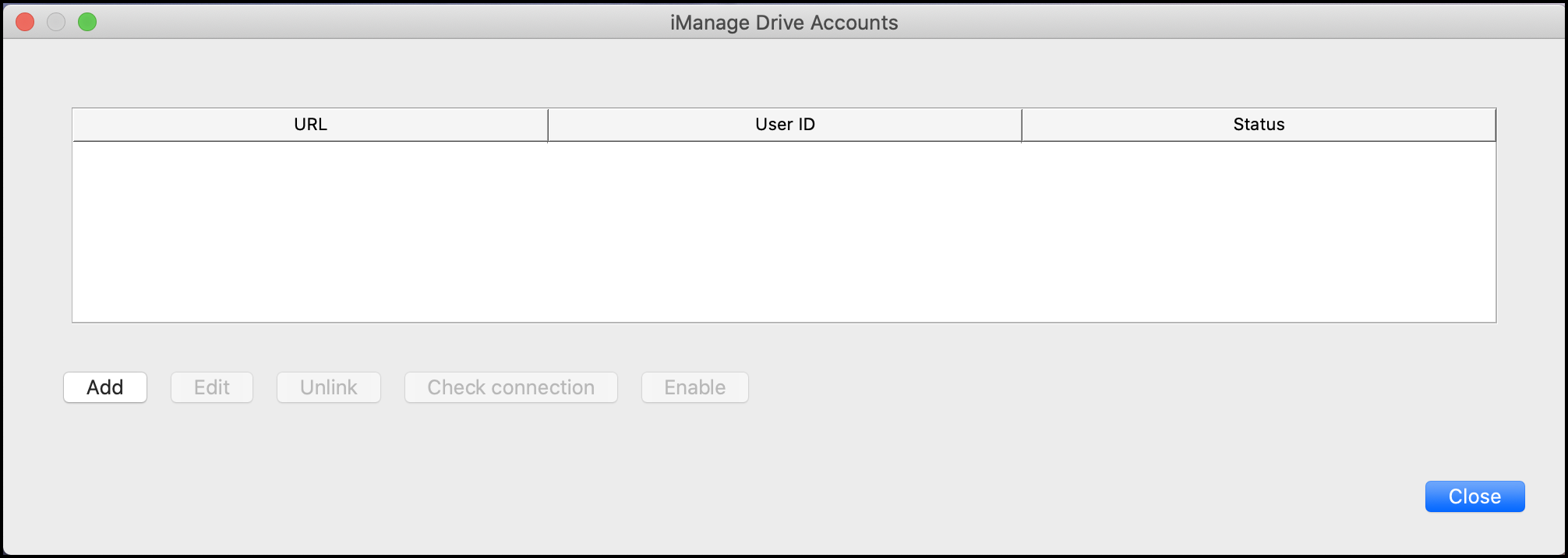 Select the iManage Drive menulet in the Mac menu bar, select the Access iManage Drive Settings icon, and select Account Settings. The iManage Drive Accounts dialog box appears.