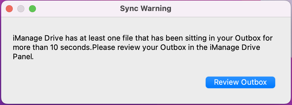 The time_before_alerting_sync_issues setting lets you set a time after which a dialog box is displayed to the users indicating that iManage Drive isn't synced and there are items that require attention in the iManage Drive Outbox. When set, the following prompt is displayed.