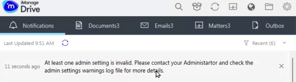 A warning log file (admin_settings_warnings.log) is also generated, telling you which admin setting has an invalid parameter. You can then browse to Settings > Show iManage Drive log folder and open the admin_settings_warnings.log file to troubleshoot the issue.