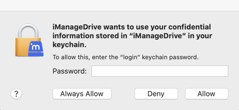 While starting iManage Drive, a warning is displayed from the Keychain Access application asking you to enter your password to allow iManage Drive to use the keychain. This keychain is used by iManage Drive to encrypt information. Select Always Allow so that you aren't prompted again when iManage Drive is restarted.