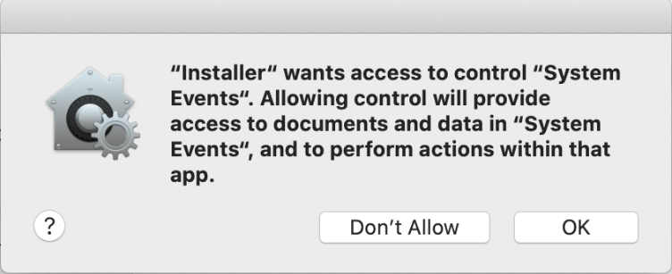 Select OK in the macOS security prompt to grant access to the installer for controlling System Events.