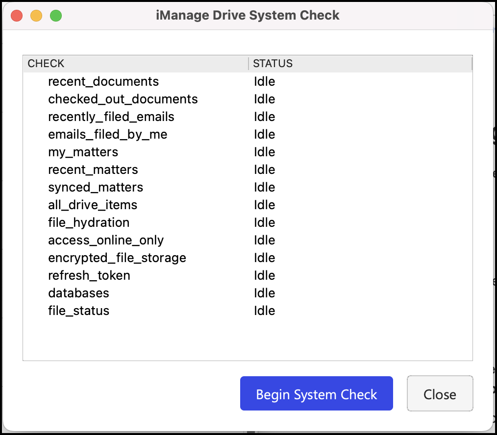 From iManage Drive for Mac 10.9.0 onwards, you can perform a health check in iManage Drive for Mac by selecting Diagonstic: system check and then selecting Begin System Check.
