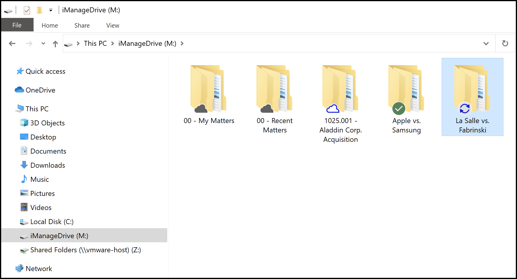 When syncing is complete, the workspace continues to appear in the My Matters or Recent Matters folder but the icon changes to indicating that the metadata is now synced to your mapped drive. Double-click the workspace to view the content in it, which also displays the icon. The workspace also appears in the root folder in your mapped drive.