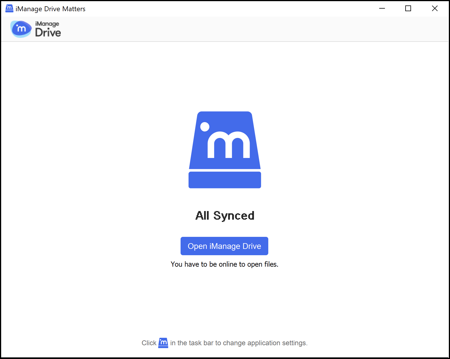The wizard notifies you when all workspaces are synced. Select Open iManage Drive to open the local drive where the workspaces are synced, or select the iManage Drive icon in the task bar to change preferences or modify application settings.