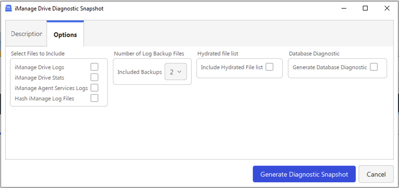 (Optional) Select Include Hydrated File list check box to include hydrated file list. The will include the list of all the files that are available as full file and not as a link or a stub in iManage Drive.