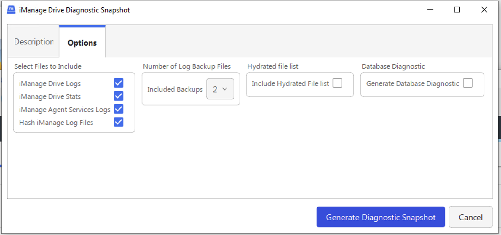 After the required information is tagged, select the Diagnostics: generate support snapshot option in Access iManage Drive settings and then select the Hash iManage Log files check box. The log file generated will then have all the tagged information encrypted.
