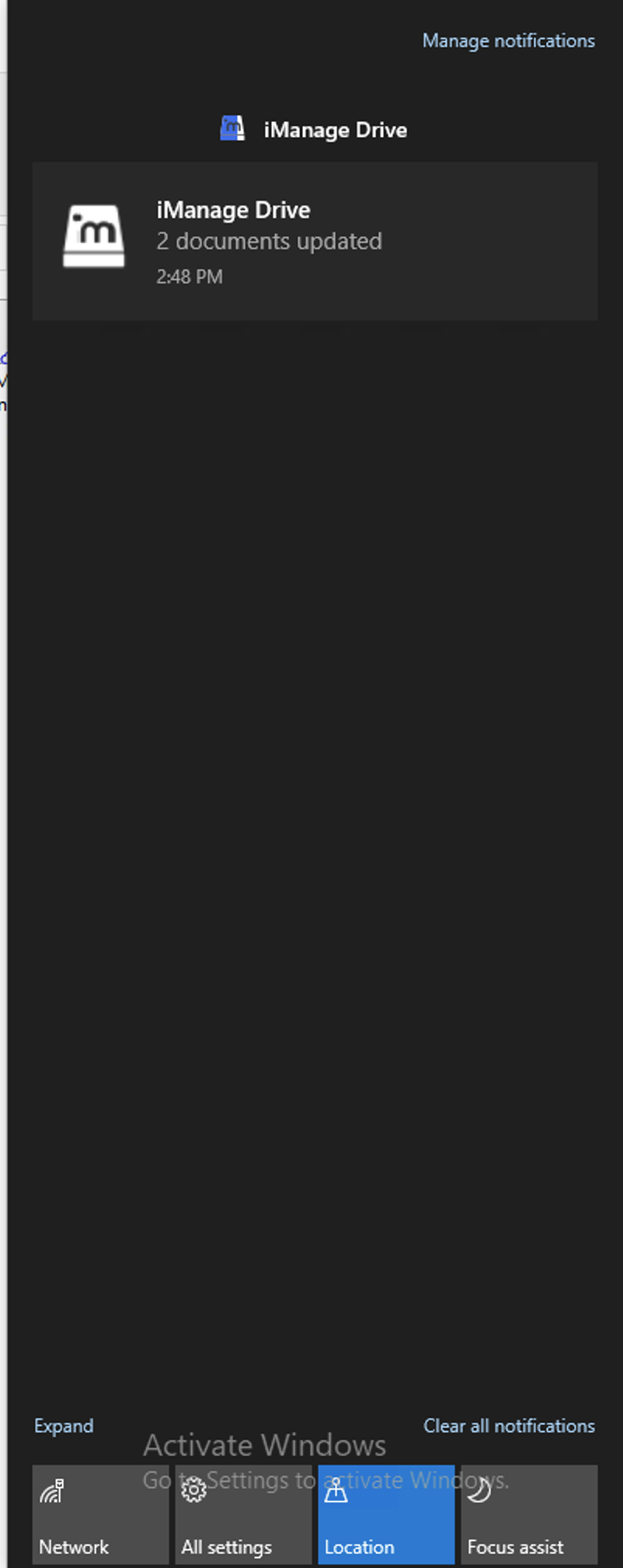 To ensure that you are receiving these notifications, we recommend that you enable Windows notifications for iManage Drive on your machine by doing the following: