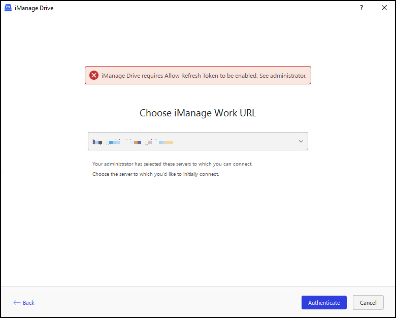 If you have set the Allow Refresh Token option to No (default value) in iManage Control Center, users may not be able to connect to iManage Drive. When they try to connect, iManage Drive application displays a notification as shown in the following figure. Hence, we recommend that you set Allow Refresh Token to Yes in iManage Control Center.