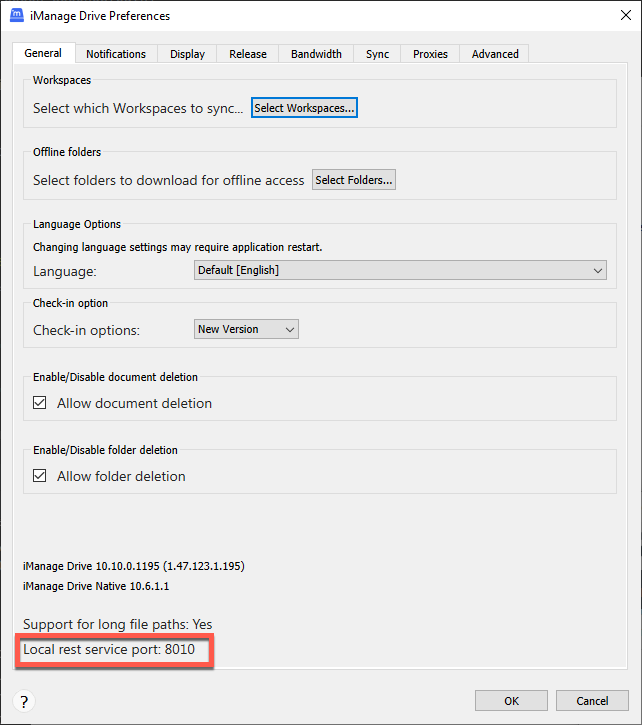 When you set the local_rest_service_port admin setting to 0, iManage Drive selects a dynamic port.
