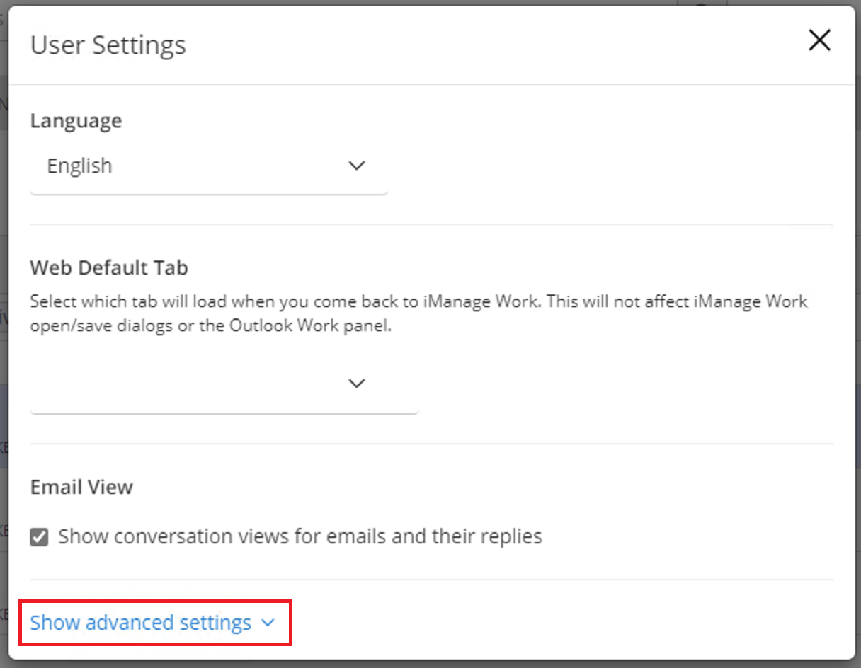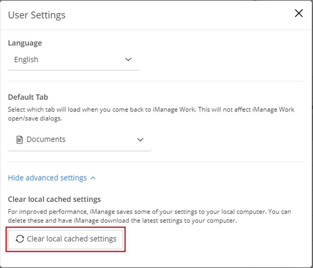 Figure: User Settings - Select Show advanced settings and then select Clear local cached settings. The cache is cleared and iManage Work reloads.