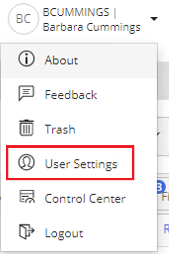 - Select your name on the upper-right corner and then select User Settings. The User Settings dialog box appears.