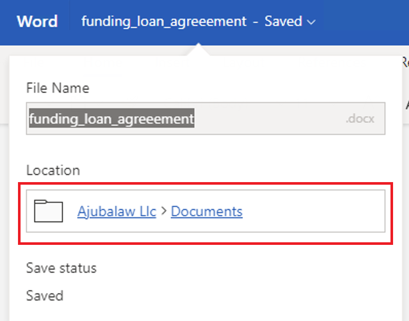 When editing a Microsoft Office file using Microsoft Office for the web, if you want to know the file location in iManage Work (workspace and parent folder), select the file name at the upper-left corner in the Microsoft Office for the web window. The workspace and parent folder name are displayed as shown in the following figure: