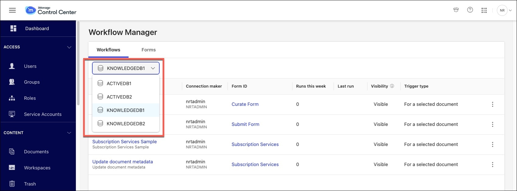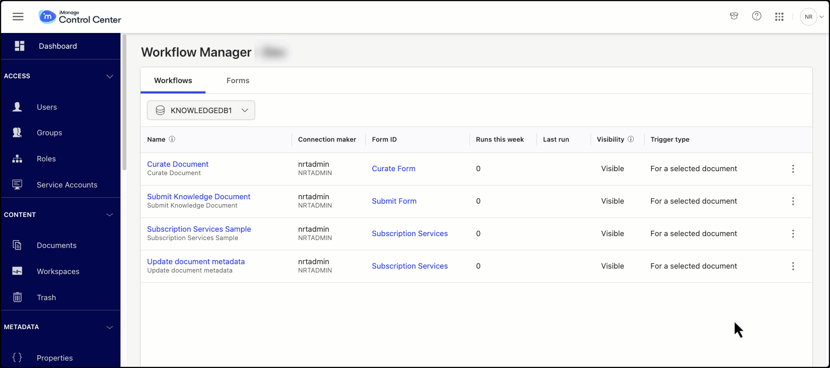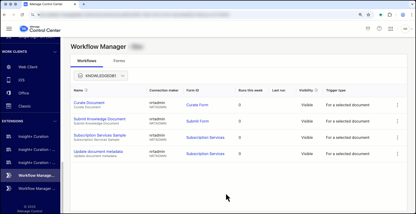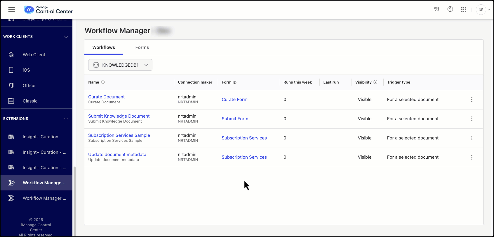 To access the Workflows list in iManage Control Center, browse to Extensions > Workflow Manager > Workflows.