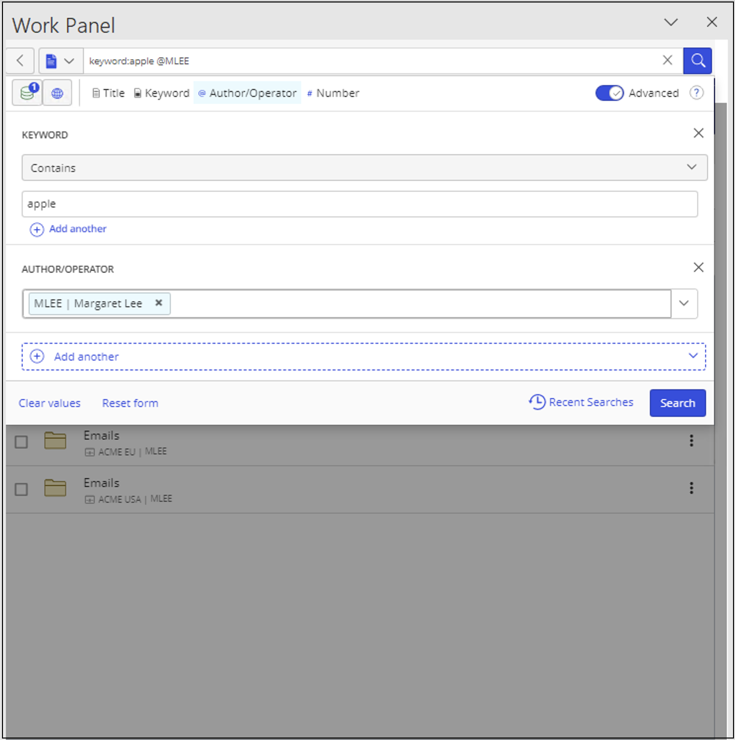 Author/Operator/Filed By: This search is performed if you’re searching for individuals associated with a document or email. While entering the name of the user, you can use the @ symbol followed by the user name to display the list of users with similar names. This input helps you select the required user without having to type the name fully. For example, @Jo displays all names that have the string Jo in them, such as John, Joseph, and Joe. Entering a space stops suggestions from being triggered.