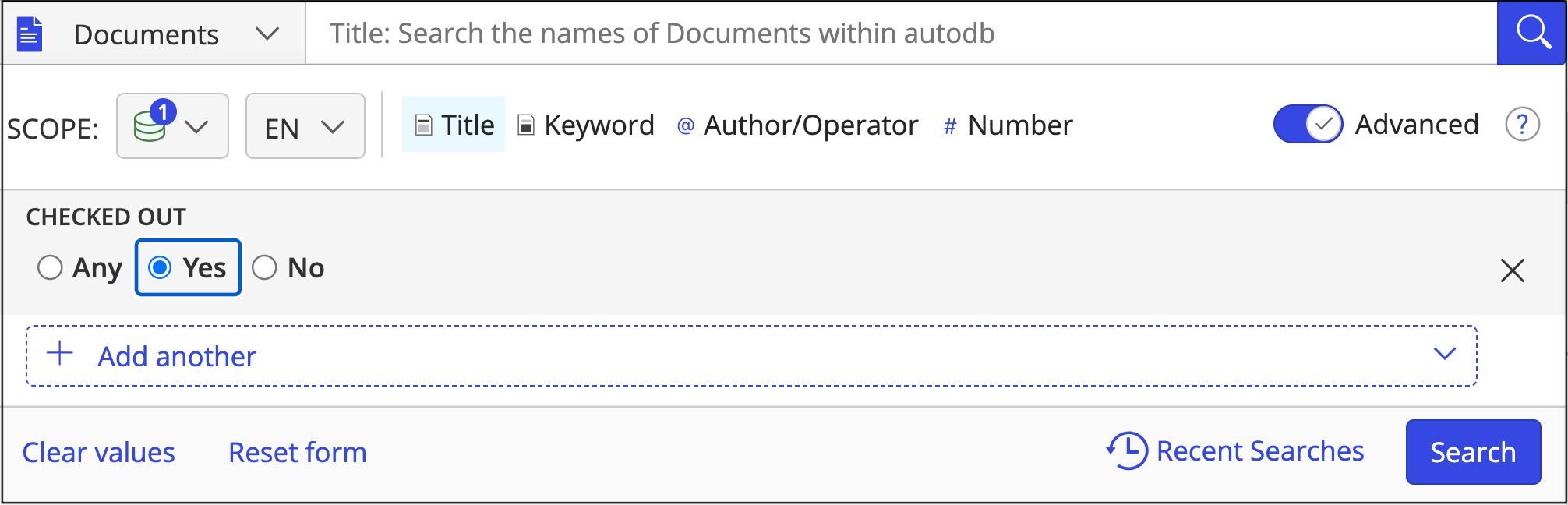 Boolean Fields | If your instance of iManage Work is configured for fields that accept Boolean fields, then based on your selected response, all the related documents are returned. Selected response: Any: system skips the search. For example—when you use the Checked Out search field, the system returns all documents that have been checked out when you specify Yes in your search criteria for this field. | Input: Yes Output: Documents conforming to your selection are returned. |