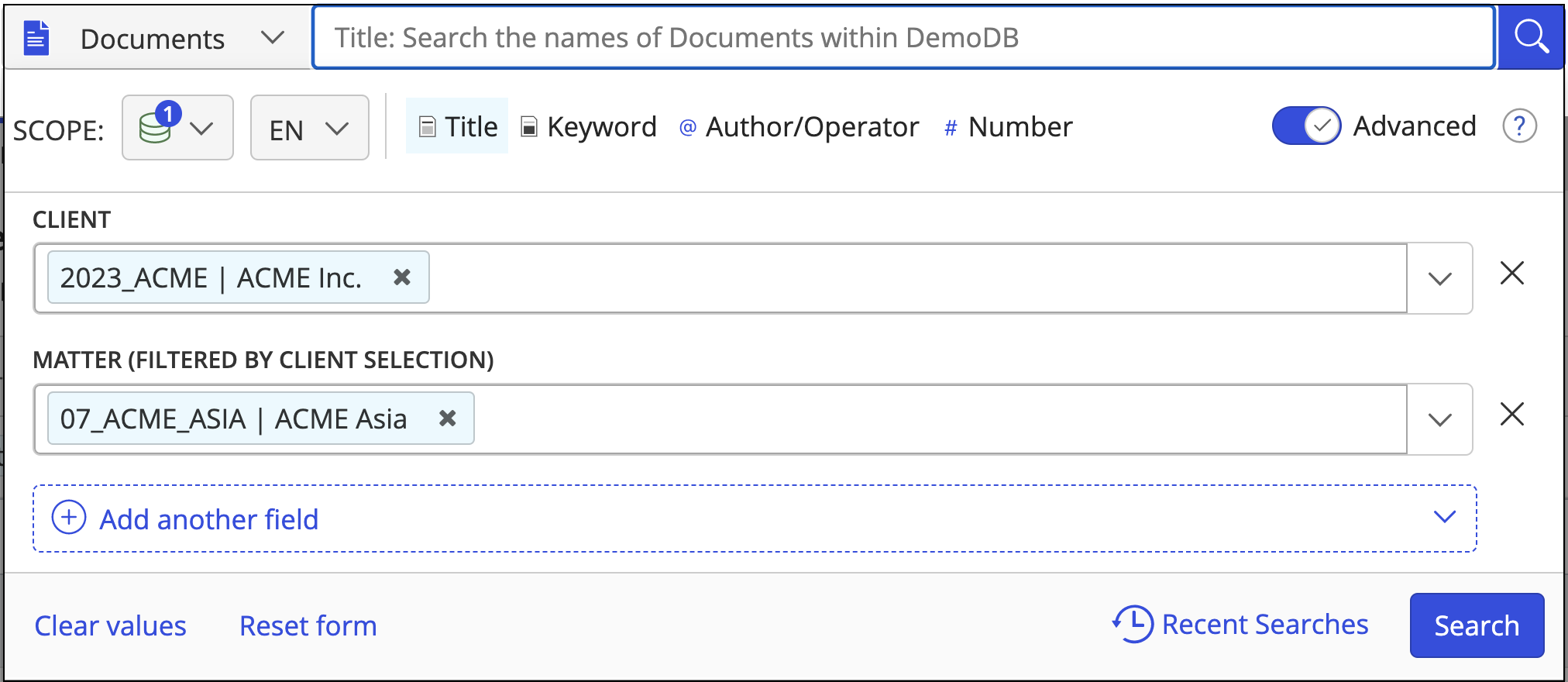 Title: This is the default option. Title search is performed against the matter names; that is, matters are returned in the search results only if the search term is a part of the matter name.