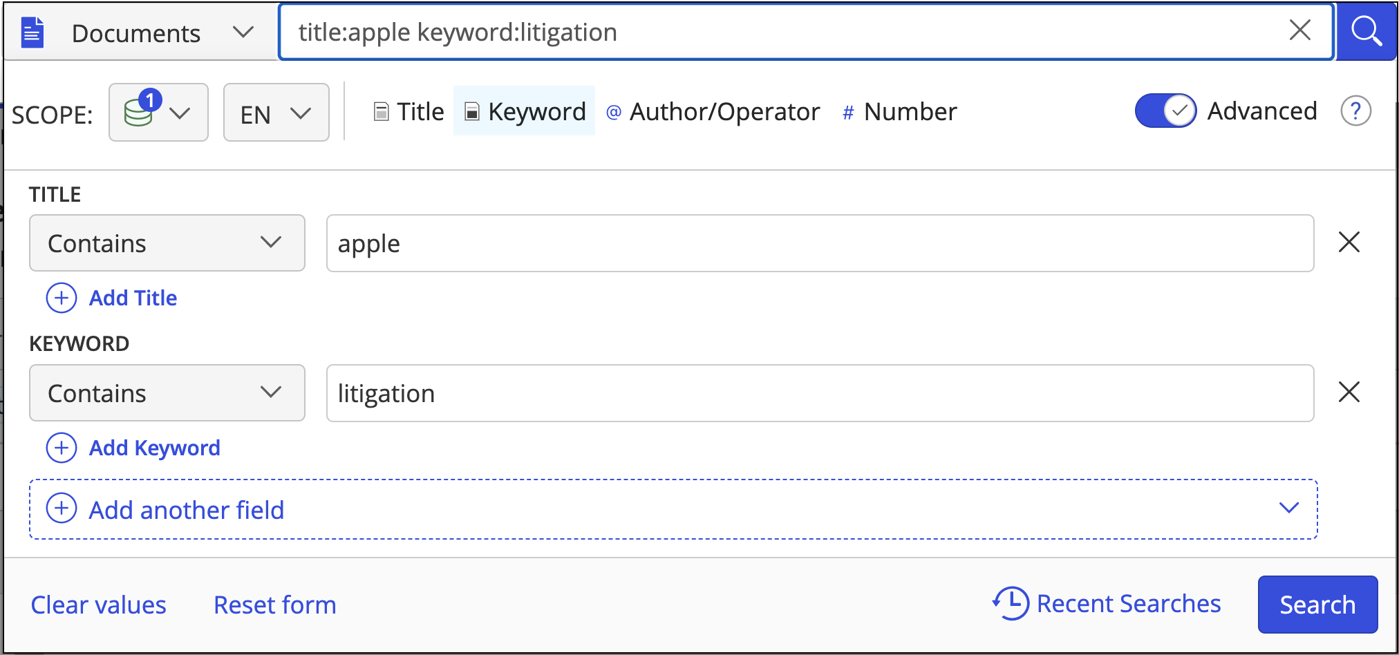 You can either set Title or Keyword as the default search value by selecting it in the search box. The default is highlighted in blue. Your selection persists unless you change it again. If Keyword isn't set as default, the default search criteria continues to be Title search for matters.