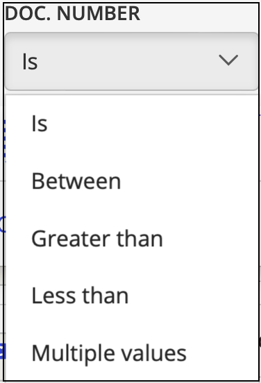 These options are available under Doc. Number. | Is | The document returned exactly matches the document number entered. If you search for the number 45678, and select the Is option, the system returns the documents whose ID is 45678. NOTE: Document numbers themselves must be entered without any commas. | Input: 45678 Output: Document Number 45678 |