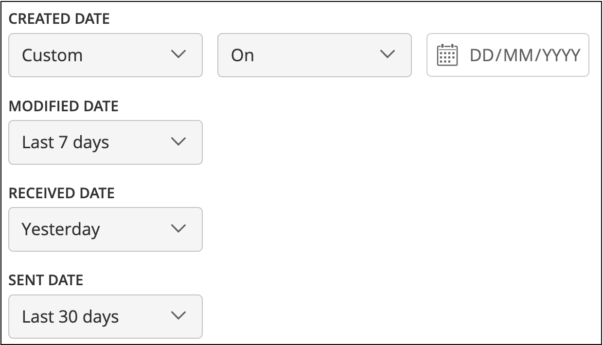 | Custom | Based on the field selected, say Created Date, all the documents that were created on a custom date are returned. | Input: 1/16/2019 Output: Documents that were created on the selected date. |