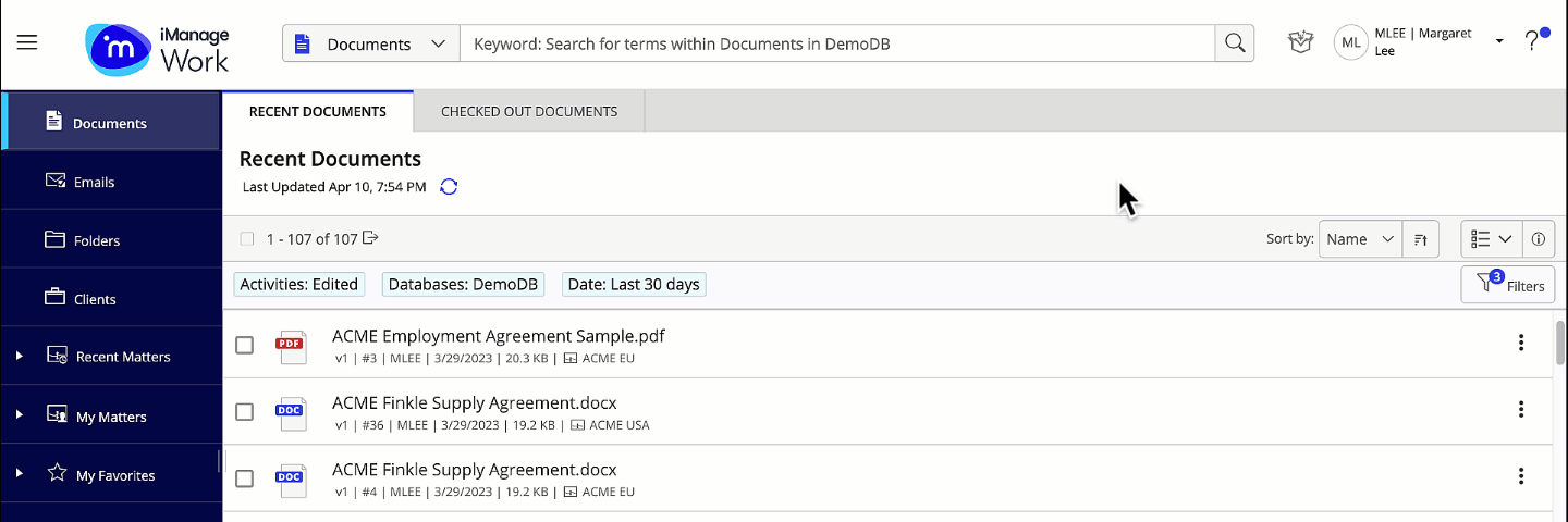 Number: Performs a search for the Document Number. It does an exact number search across the entire library, even if you’re within a folder. As a quick search option in iManage Work 10 clients, you can enter the pound (#) sign in the search box, followed by the document number. For example, entering #10 would search for document number 10.