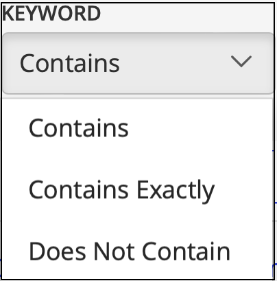 Does Not Contain | Documents/Emails/Matters that contain the keyword are excluded from the search results. | Input: Credit Output: Every document that doesn't have the term credit is returned in the search results. | |