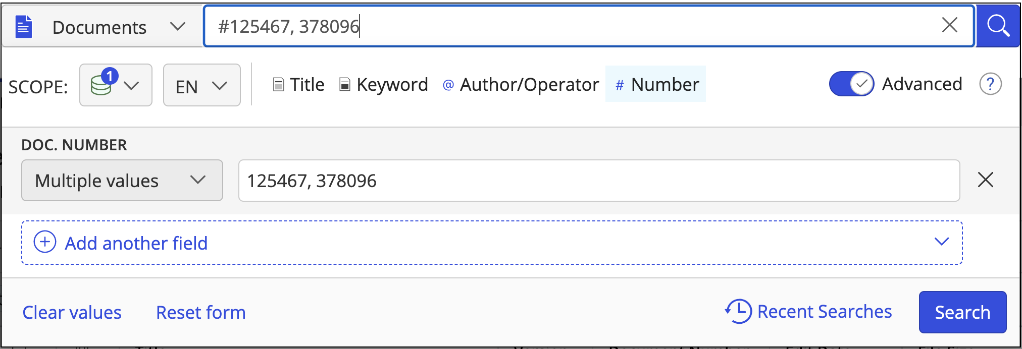 Multiple values | Multiple specific documents may be searched for, separated by a comma. If you search for ‘45678, 56789’ the system returns both the documents with those IDs. | Input: 45678, 56789 Output: Document Number 45678, Document Number 56789 | |