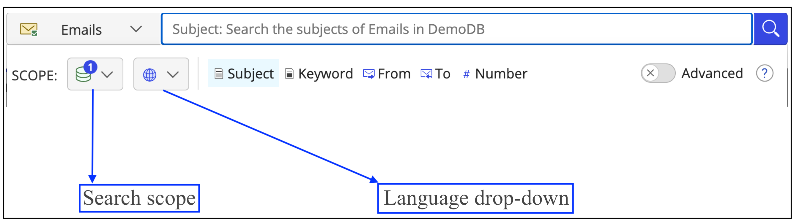 When performing a simple or advanced search, you can define the scope for each search type along with the search language in which you wish to perform the search.