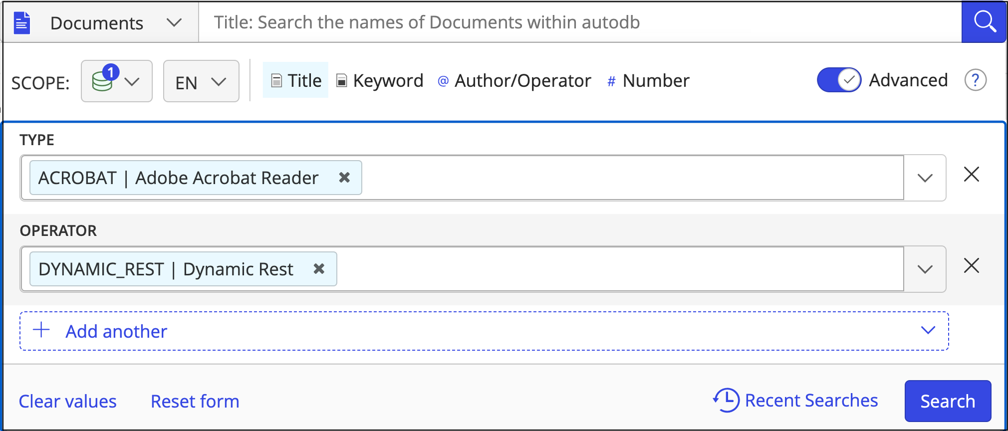 For example: Author, Operator, Type, and Status | Validated Fields | These are drop-down lists displaying the values that you can choose from. Based on the value selected, all related documents are returned. | Input: Type and Operator Output: Documents of the acrobat type with operator DYNAMIC_REST are returned. |