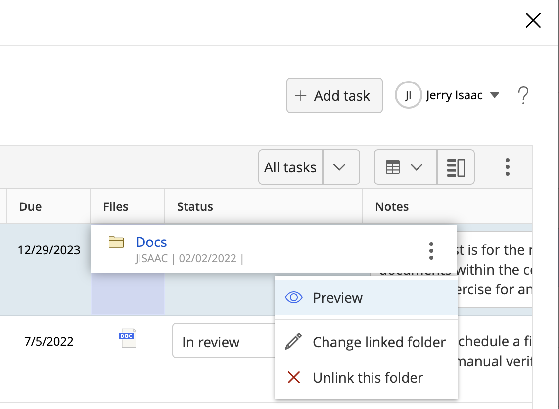 Select the file or folder icon or press enter when focus is on the attachment to view the metadata for the file or folder. The keyboard shortcuts for these actions are also displayed as a tooltip. Select to access the kebab menu that has the Preview, Change linked file/Change linked folder, and Unlink this file/Unlink this folder options.