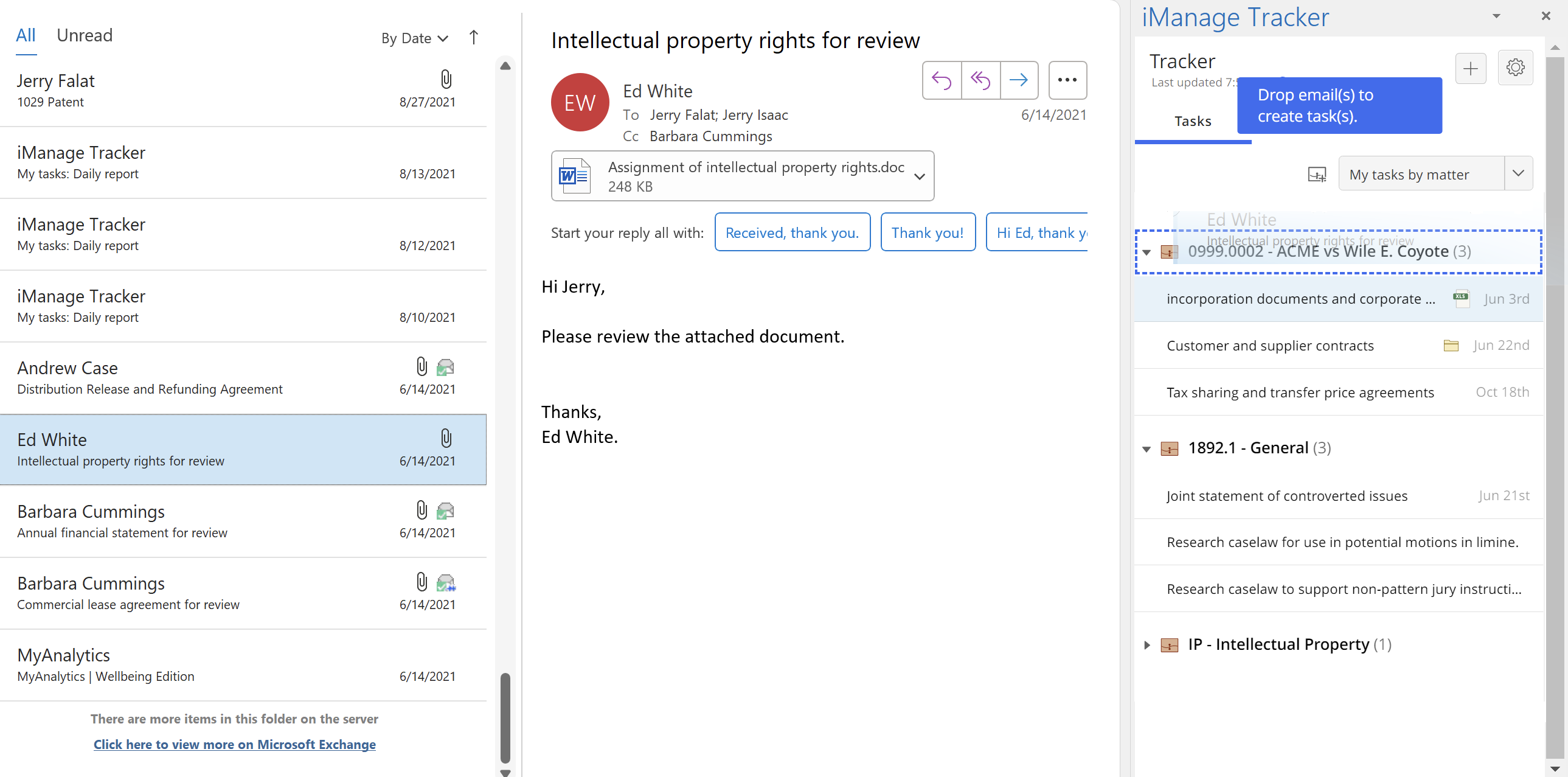On the Tasks tab of the iManage Tracker panel in Microsoft Outlook, create tasks for yourself that simply by dragging a required email to a matter.