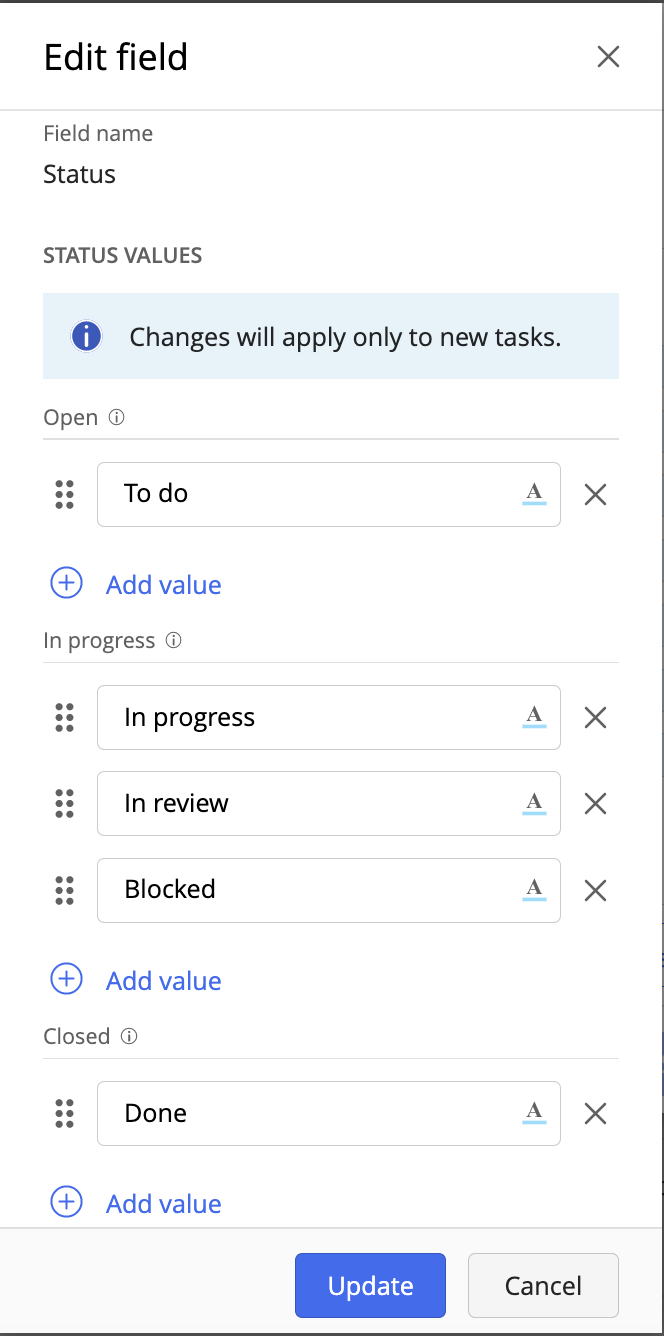 Select Add value and enter a name for the new status.