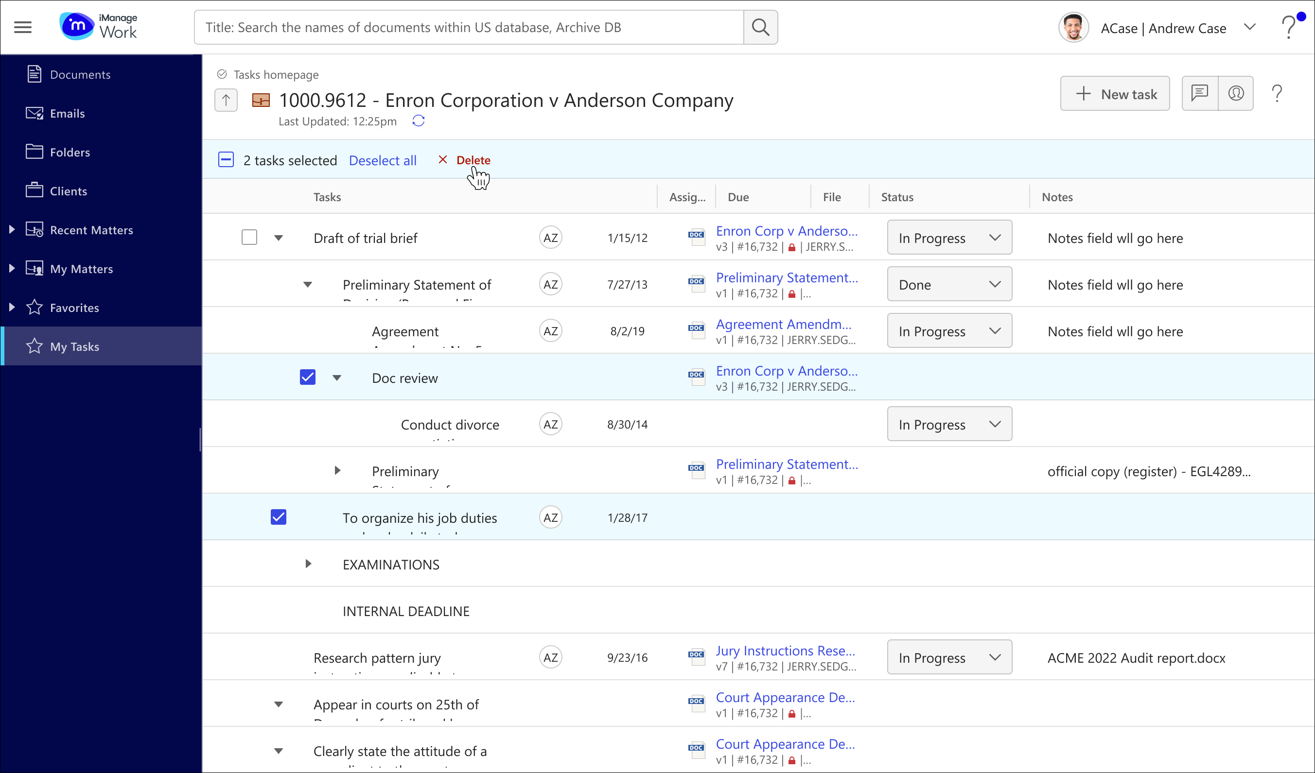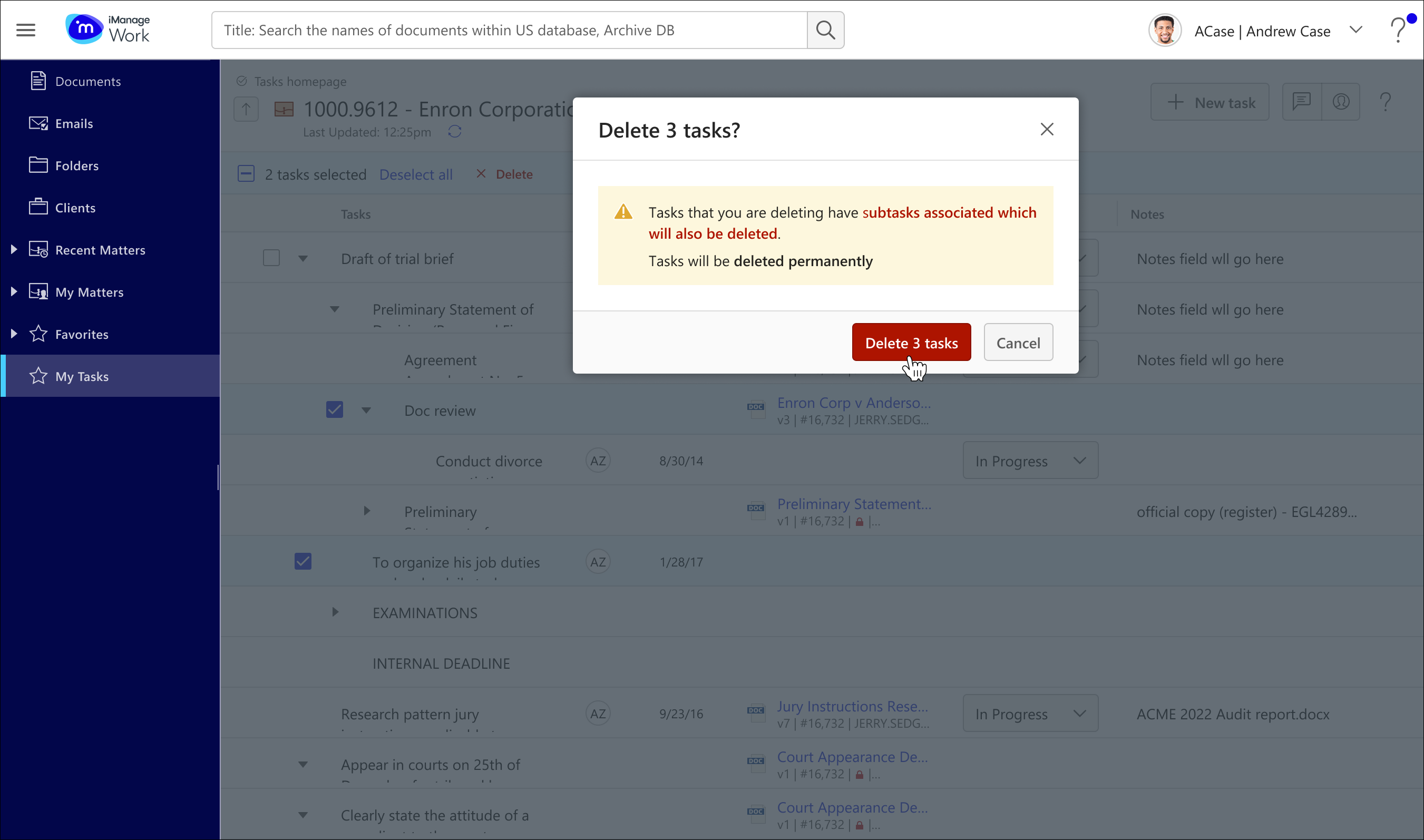 There are multiple ways to delete tasks in iManage Tracker.