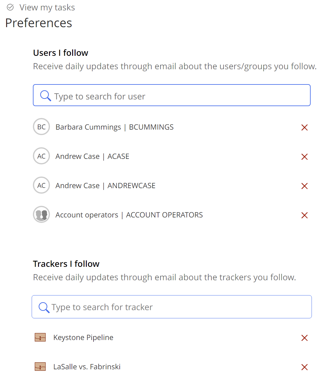 If you follow trackers by selecting More options in the upper-right corner and then selecting Start following, the trackers are also listed on the Preferences page.Figure: Users, groups, and trackers followed(Optional) Select to remove a user or group you no longer wish to receive email updates on.