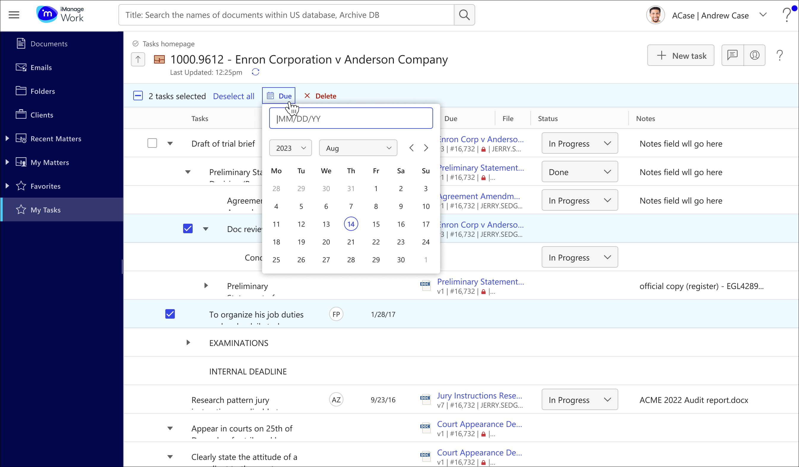 There are two ways to set the due date for tasks in iManage Tracker. One is to set the due date individually, and the other is to set a bulk due date for multiple tasks at the same time.