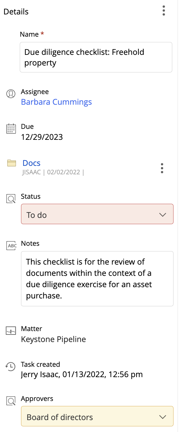 Sign in to iManage Work, browse to the matter for which you want to update task details, and select .