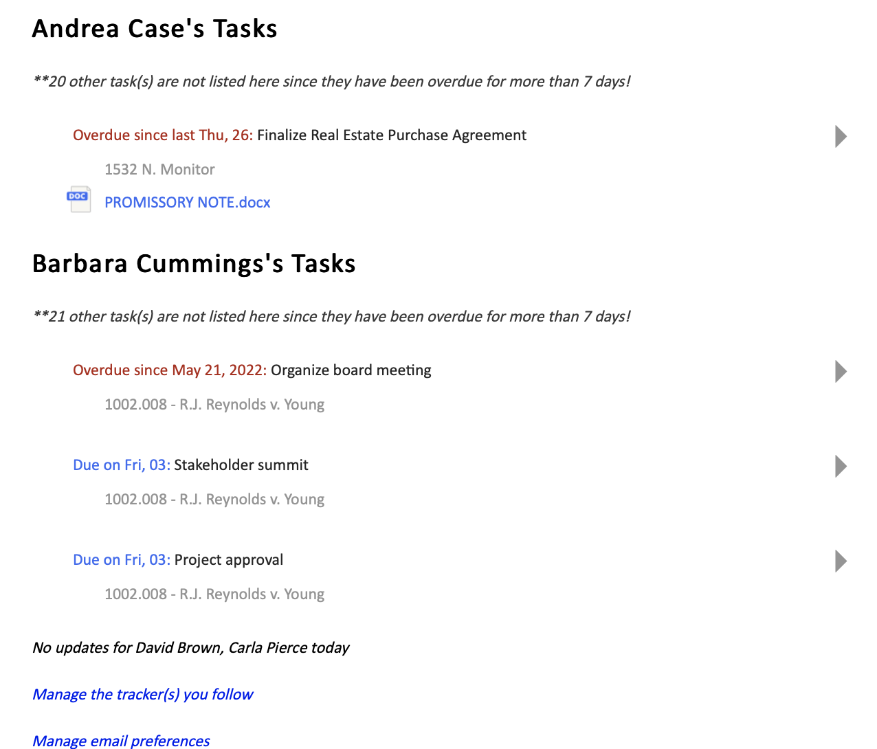 iManage Tracker sends you a daily report of the tasks for users and groups and updates about the trackers you have selected using the Preferences option. The updates are listed separately for each user and have the same components and features as the updates you receive for your tasks.