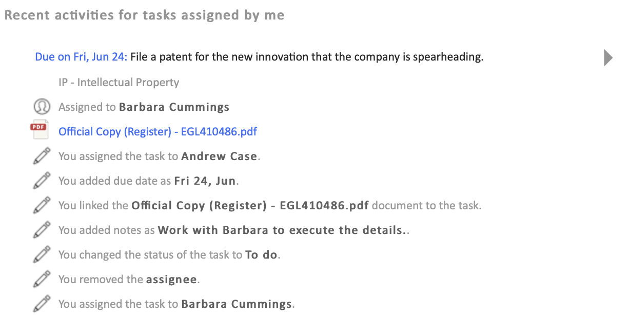For example, changes to the assignee, changes at the workspace level that affect the access rights of assigner/assignee/others, status, and due date, file attachments, and so on. The name of the user is displayed along with information about the change.