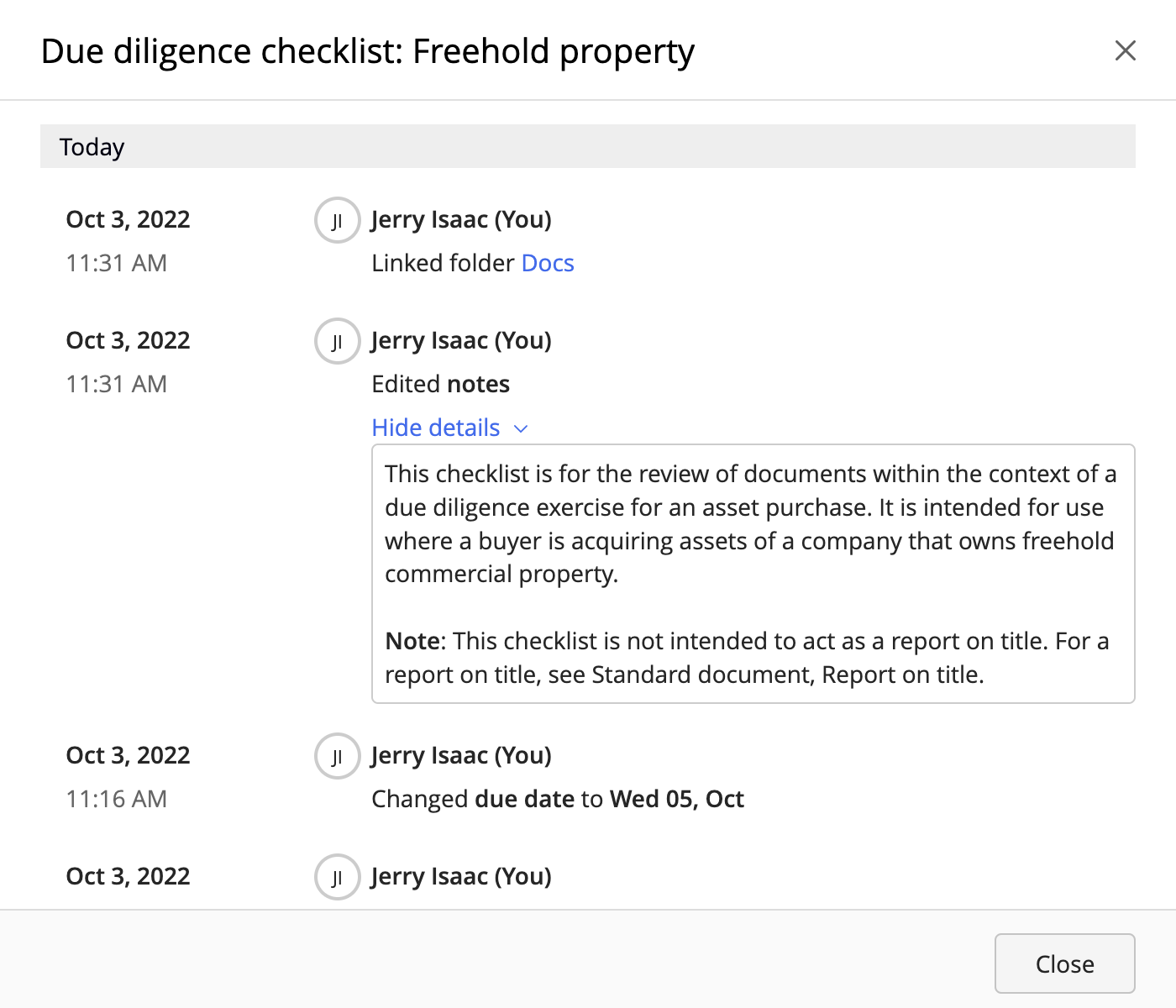 Details such as the date and time an update was made, what was changed, and the name of the user who made the change are available in the Timeline.