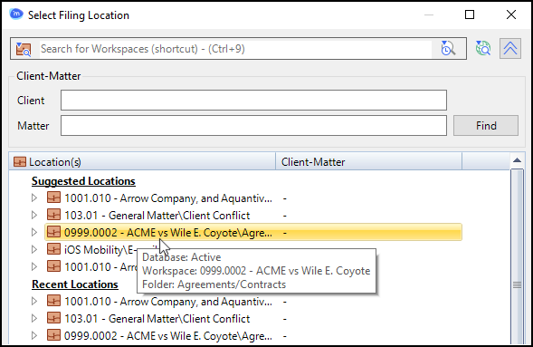 | Specify whether Search for Workspaces should be the default option in the Filing Location's search bar in the Send and File and Browse and File dialog boxes. |