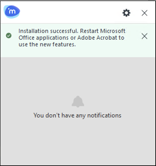 Additionally, the following notification appears on iManage Work Agent indicating that iManage Work Desktop for Windows is successfully installed on your device. This message indicates that the latest version of iManage Work Desktop for Windows is installed on your device and you have to restart all Microsoft 365 and Adobe Acrobat applications to use the latest version of iManage Work Desktop for Windows.