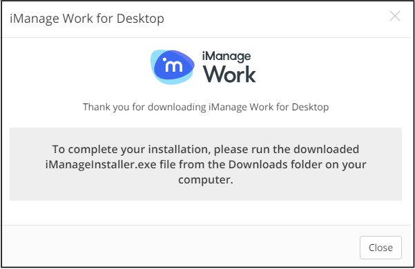 Figure: iManage banner to download iManage Work Desktop for WindowsSelect Download iManage Work for Windows. The iManageInstaller.exe file is downloaded to your device, and the following screen appears. Select Close.