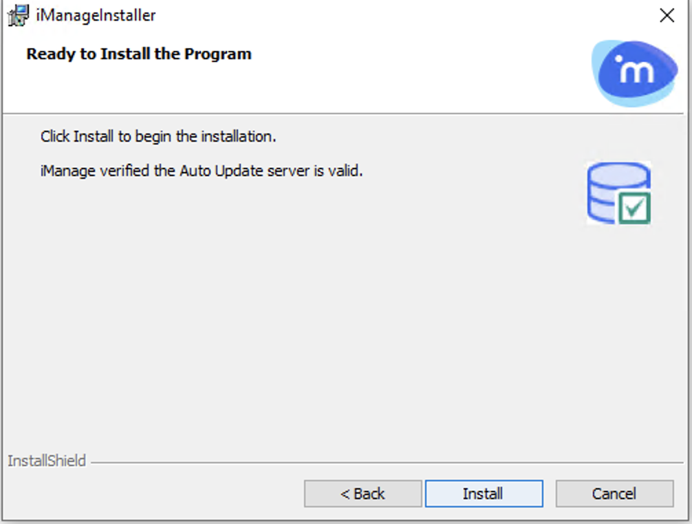 (Optional) To set up your own update server, you can configure this location.Select Install. iManage Installer starts the download.