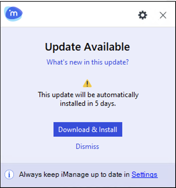 From iManage Work Desktop for Windows 10.9.3 onward, the new option UpdateCountdownInDays is added to the Workagent configuration option in the imWorkOptions.xml configuration file. Specify the deadline using the UpdateCountdownInDays option. This feature is turned off by default.